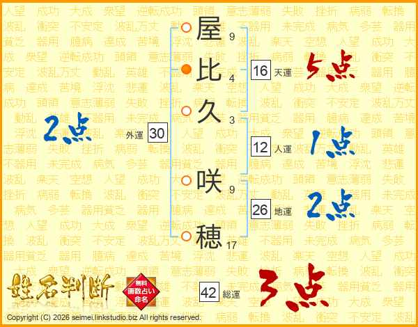 屋(9画)比(4画)久(3画) 咲(9画)穂(17画)