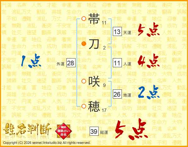 帯刀咲穂さんの総運は39画の5点!