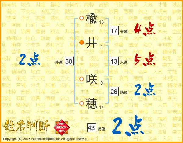楡井咲穂さんの総運は43画の2点!