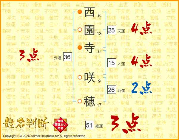 西(6画)園(13画)寺(6画) 咲(9画)穂(17画)