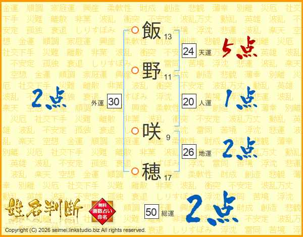 飯野咲穂さんの地運は26画の2点!