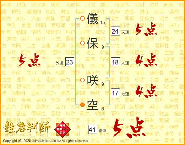 生活面を象徴する運勢です。外部から受ける影響力を表し、結婚運、家庭運や職場、環境への順応性を表します。総運から人運を引いた画数。姓や名が1文字の場合を除く。