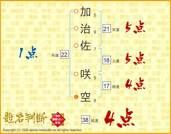 加治佐咲空さんの総運は38画の4点!