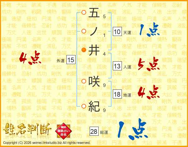 五(5画)ノ(1画)井(4画) 咲(9画)紀(9画)