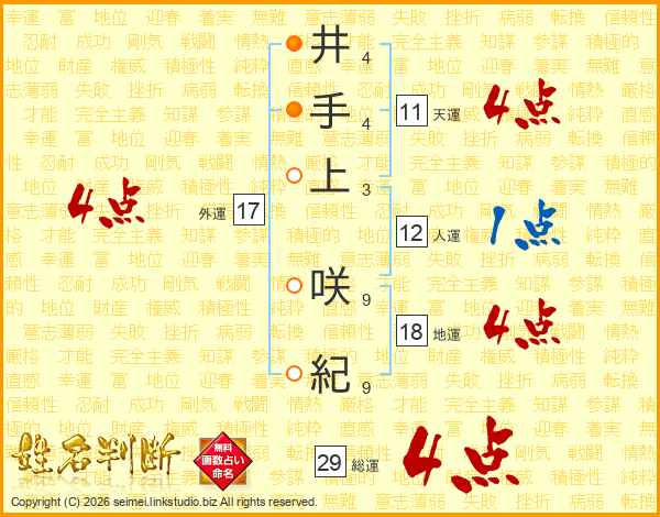 井(4画)手(4画)上(3画) 咲(9画)紀(9画)