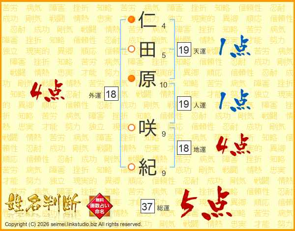 仁(4画)田(5画)原(10画) 咲(9画)紀(9画)