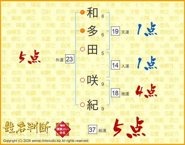 和(8画)多(6画)田(5画) 咲(9画)紀(9画)