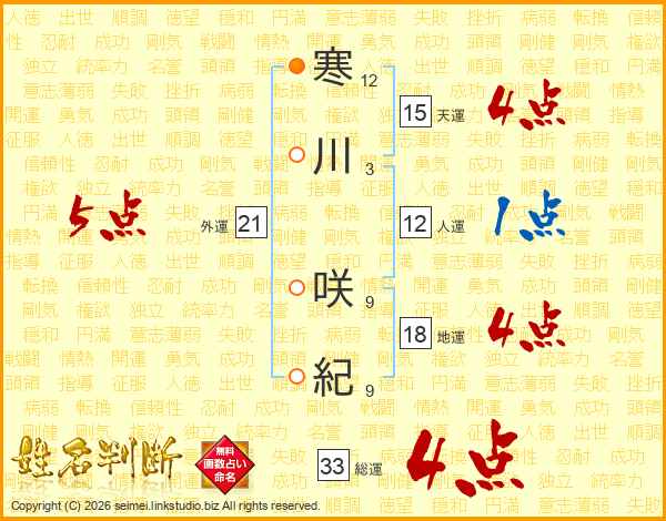 寒川咲紀さんの総運は33画の4点!