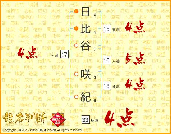 日(4画)比(4画)谷(7画) 咲(9画)紀(9画)