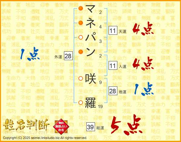 マ(2画)ネ(4画)パ(3画)ン(2画) 咲(9画)羅(19画)