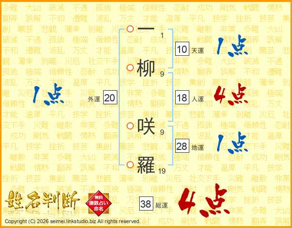 一柳咲羅さんの総運は38画の4点!