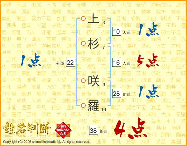上杉咲羅さんの総運は38画の4点!