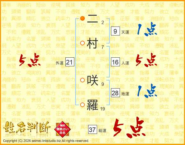 二村咲羅さんの総運は37画の5点!