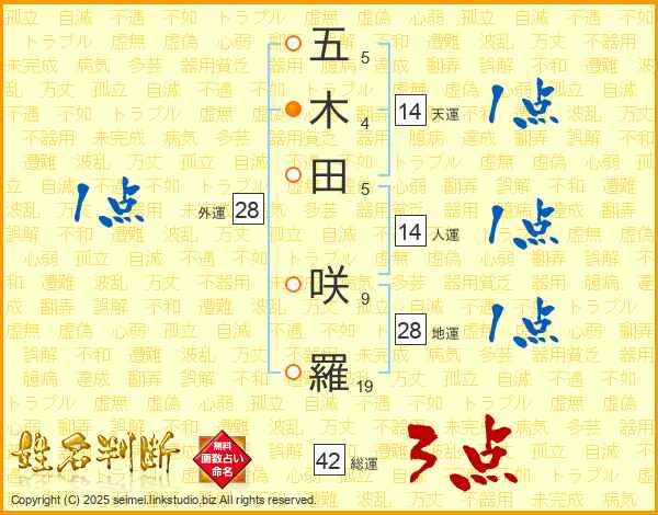 五(5画)木(4画)田(5画) 咲(9画)羅(19画)