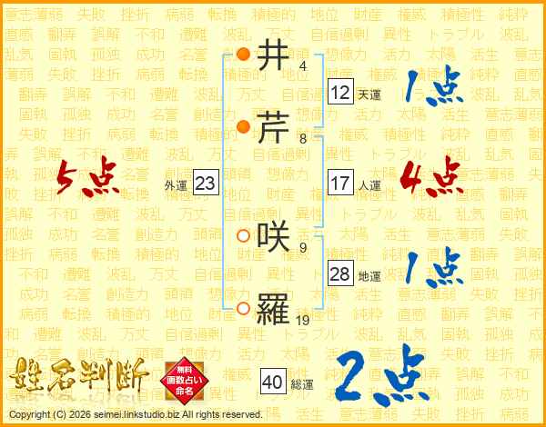 井(4画)芹(8画) 咲(9画)羅(19画)