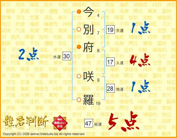 今別府咲羅さんの総運は47画の5点!