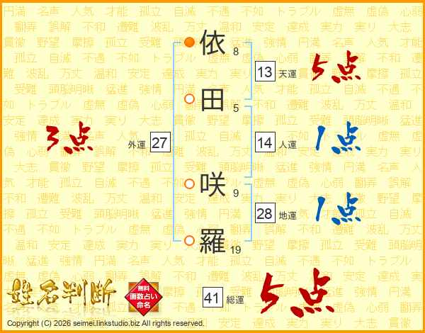 依(8画)田(5画) 咲(9画)羅(19画)