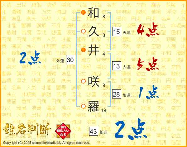 和(8画)久(3画)井(4画) 咲(9画)羅(19画)