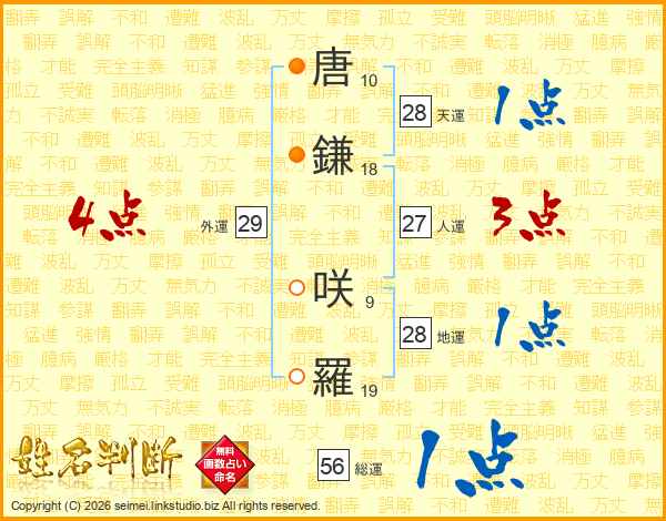 唐(10画)鎌(18画) 咲(9画)羅(19画)