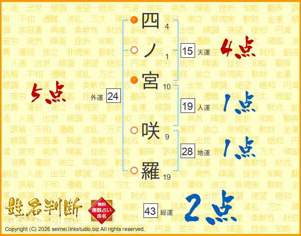 四(4画)ノ(1画)宮(10画) 咲(9画)羅(19画)