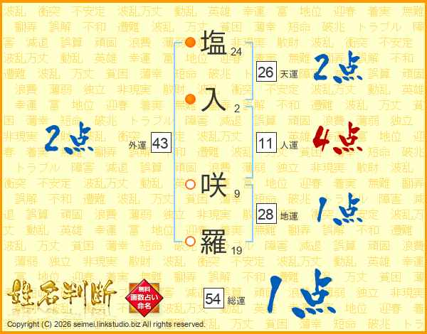 塩(24画)入(2画) 咲(9画)羅(19画)