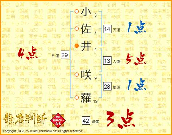 小(3画)佐(7画)井(4画) 咲(9画)羅(19画)