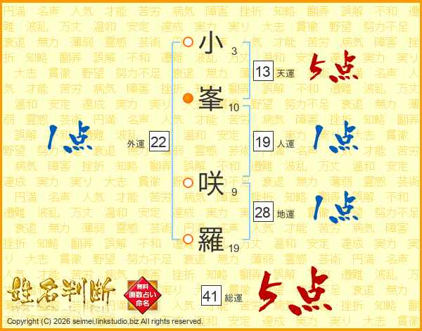小峯咲羅さんの総運は41画の5点!