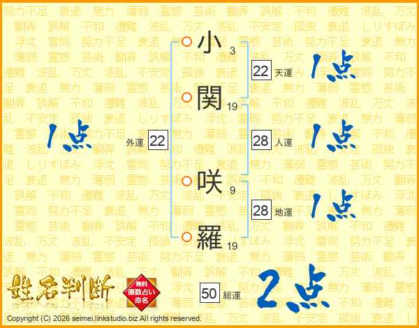 小(3画)関(19画) 咲(9画)羅(19画)