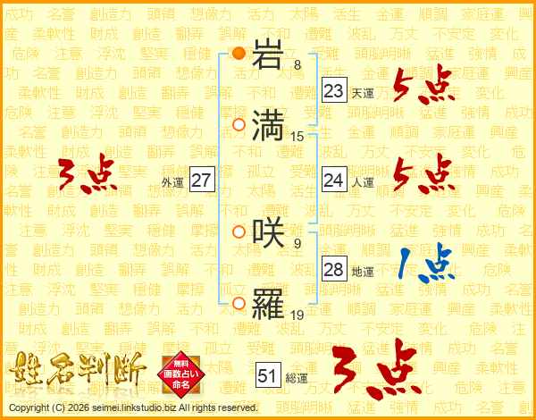 岩(8画)満(15画) 咲(9画)羅(19画)