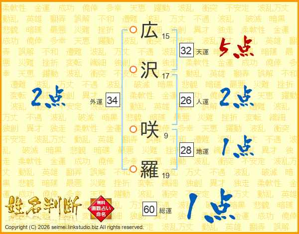 広(15画)沢(17画) 咲(9画)羅(19画)