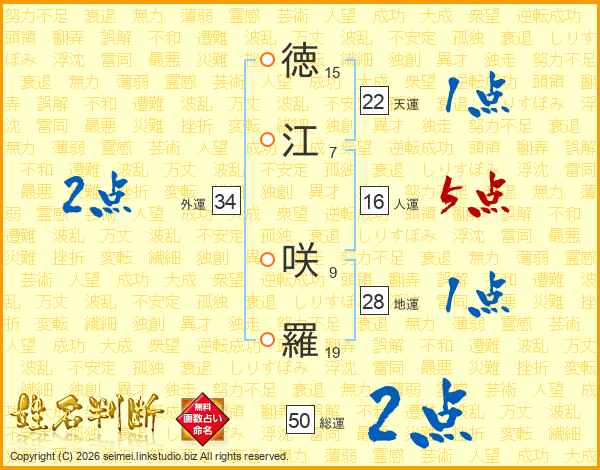 徳(15画)江(7画) 咲(9画)羅(19画)