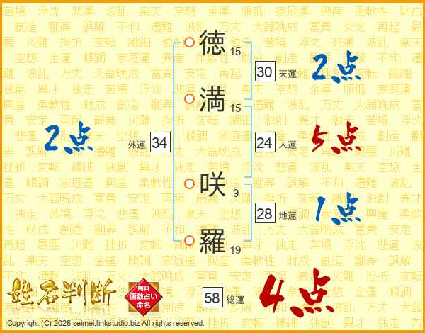 徳(15画)満(15画) 咲(9画)羅(19画)