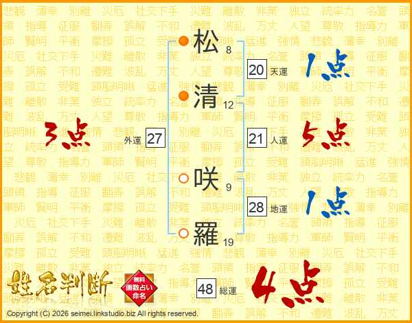 生活面を象徴する運勢です。外部から受ける影響力を表し、結婚運、家庭運や職場、環境への順応性を表します。総運から人運を引いた画数。姓や名が1文字の場合を除く。