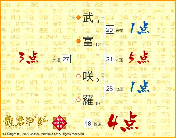武(8画)富(12画) 咲(9画)羅(19画)
