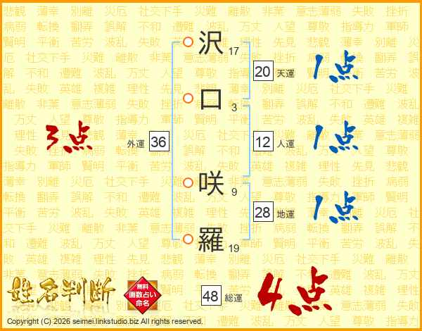 沢(17画)口(3画) 咲(9画)羅(19画)
