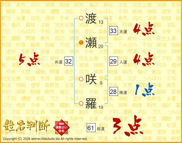 渡(13画)瀬(20画) 咲(9画)羅(19画)