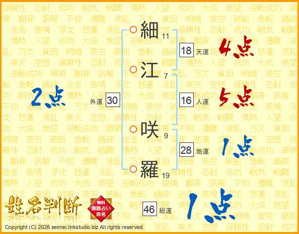あなたの人生を表す1番重要な運勢です。生涯を通じて影響する総合運となり、主に50歳以降の晩年期に影響を及ぼします。苗字と名前の合計画数。