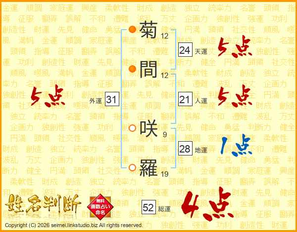 菊(12画)間(12画) 咲(9画)羅(19画)