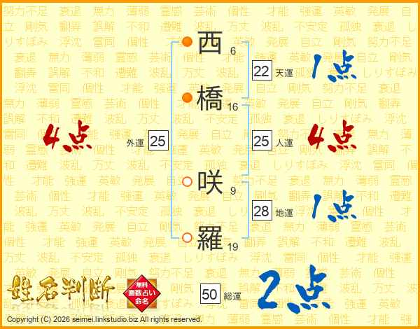 西橋咲羅さんの人運は25画の4点!