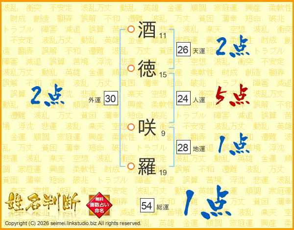 酒(11画)徳(15画) 咲(9画)羅(19画)