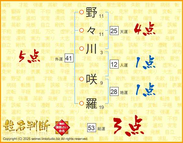 野(11画)々(11画)川(3画) 咲(9画)羅(19画)