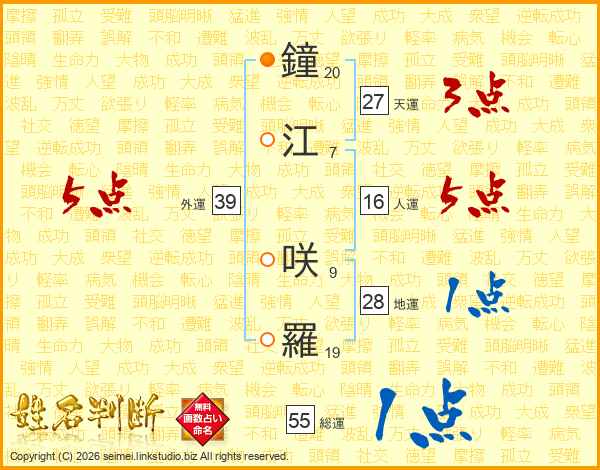 鐘江咲羅さんの外運は39画の5点!