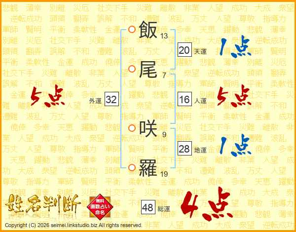 飯(13画)尾(7画) 咲(9画)羅(19画)
