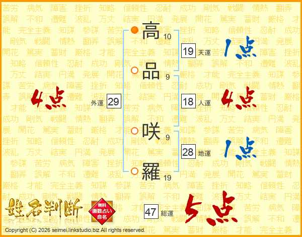 高品咲羅さんの総運は47画の5点!