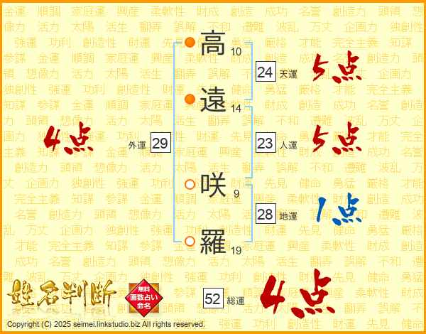 高(10画)遠(14画) 咲(9画)羅(19画)