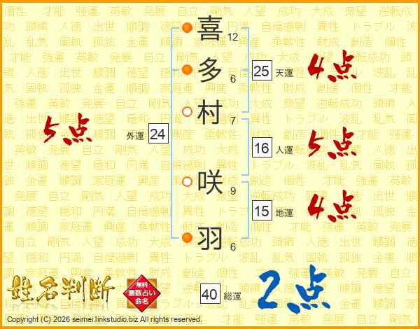 喜(12画)多(6画)村(7画) 咲(9画)羽(6画)