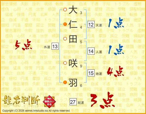 大(3画)仁(4画)田(5画) 咲(9画)羽(6画)