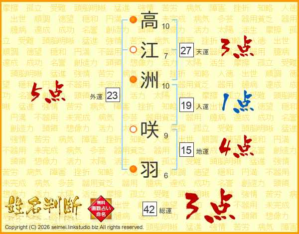 高(10画)江(7画)洲(10画) 咲(9画)羽(6画)