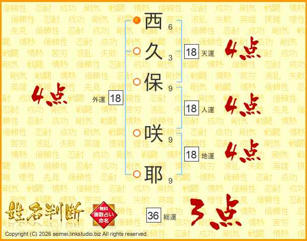 西(6画)久(3画)保(9画) 咲(9画)耶(9画)