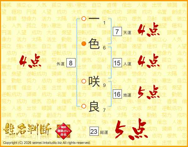 生活面を象徴する運勢です。外部から受ける影響力を表し、結婚運、家庭運や職場、環境への順応性を表します。総運から人運を引いた画数。姓や名が1文字の場合を除く。
